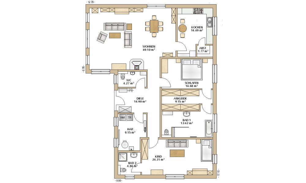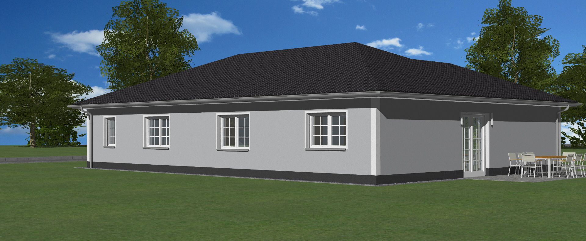 Unser Haustyp 126 hält für jeden Bewohner seinen eigenen Bereich bereit. Für die Eltern gibt es eine Kombination mit Schlafzimmer, Ankleide und Bad. Das Kind des Hauses freut sich über ein großes Zimmer mit eigenem Duschbad. Zusätzlich gibt es für Gäste ein separates WC. Das große Wohnzimmer des 157 m² großen Bungalows hat viele große Fenster, die je nach Grundstücksausrichtung auch auf der langen Zimmerseite eingebaut werden können.