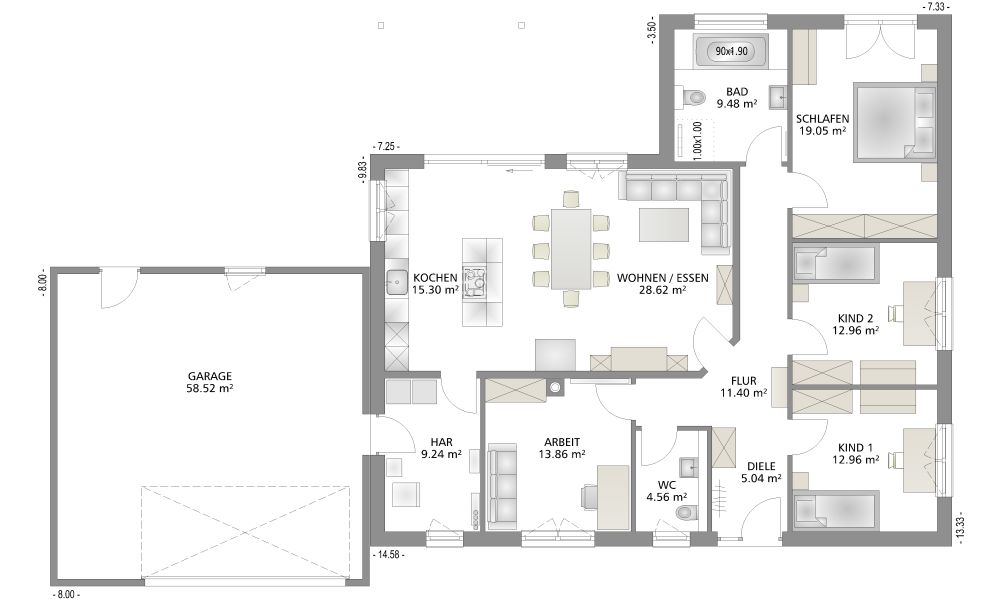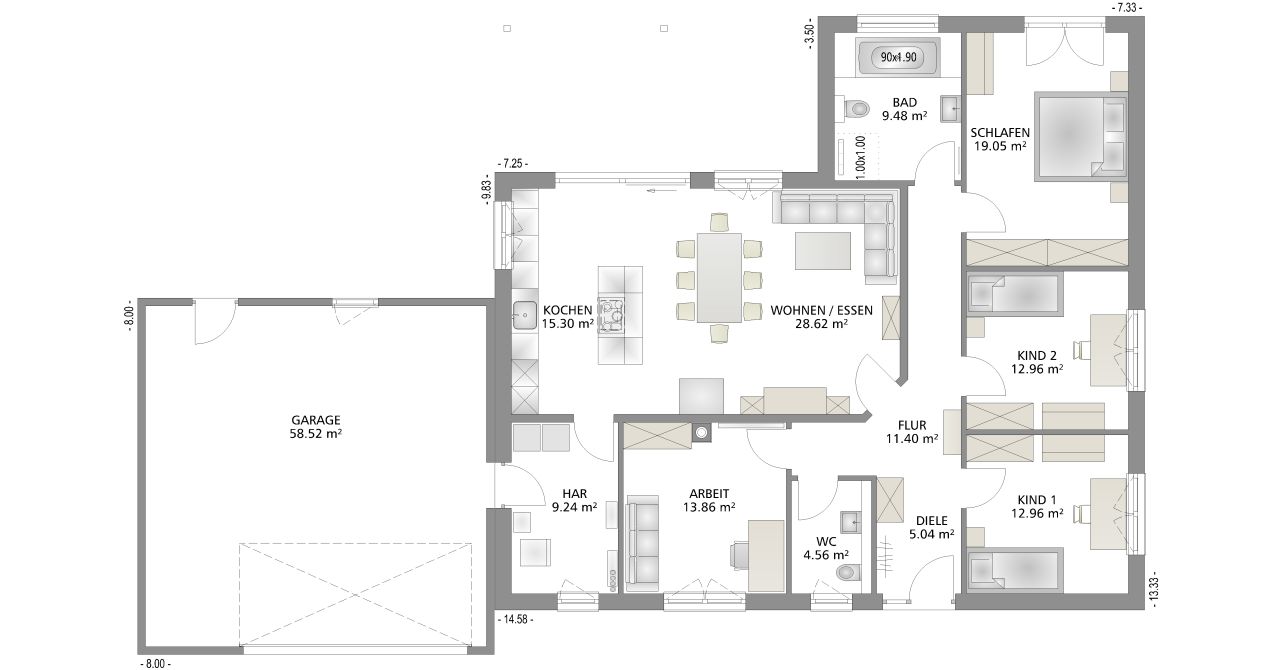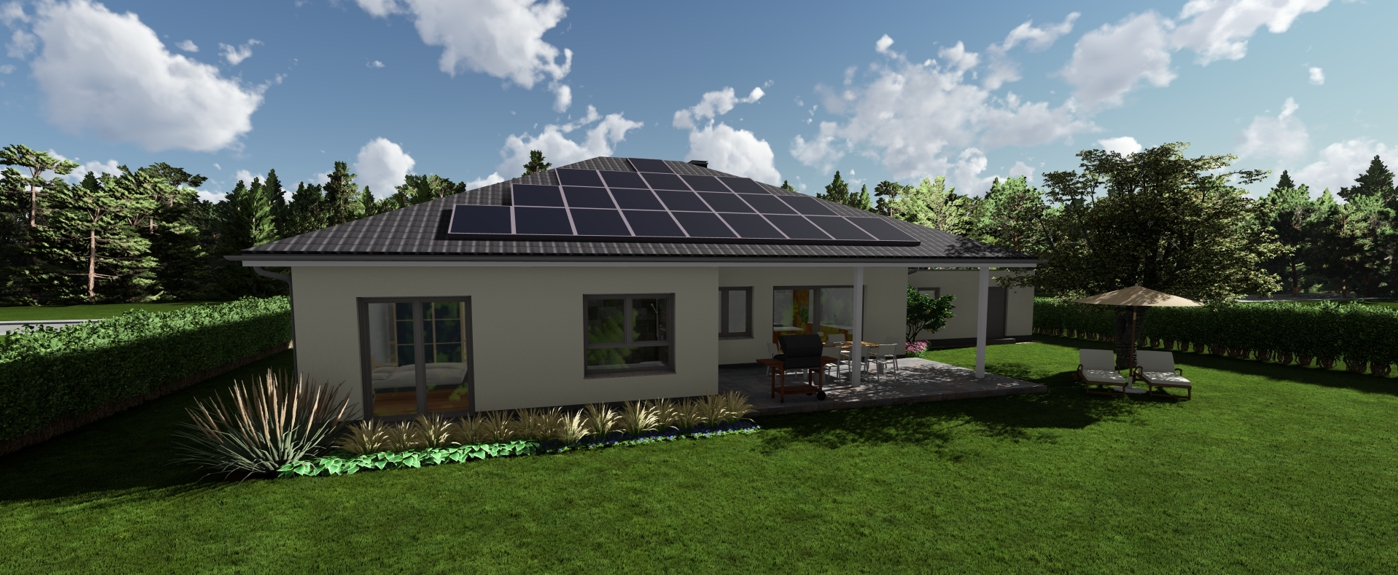 Der große Wohn-Essbereich ist der Treffpunkt für die ganze Familie. Im Sommer können Sie diesen unter die große überdachte Terrasse verlagern, die durch eine große Hebe-/Schiebetür erreichbar ist. Zwei Kinderzimmer, ein geräumiges Schlafzimmer und ein Raum für Homeoffice oder Gäste komplettieren das Haus.