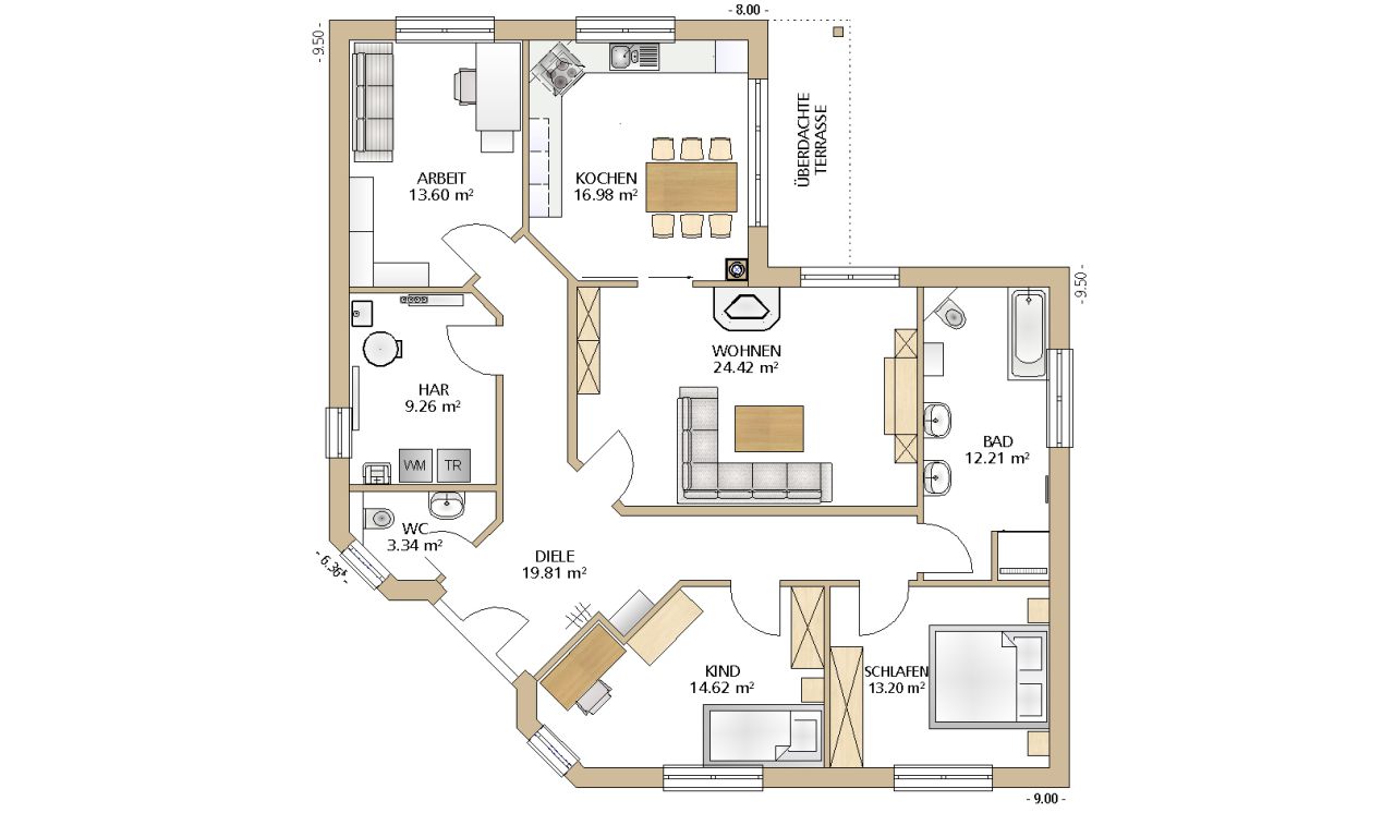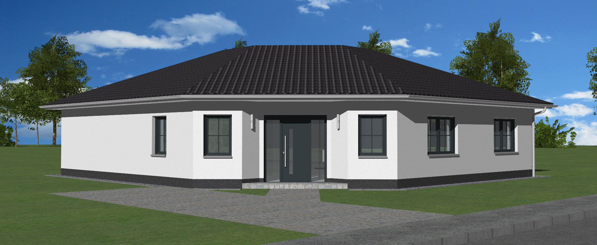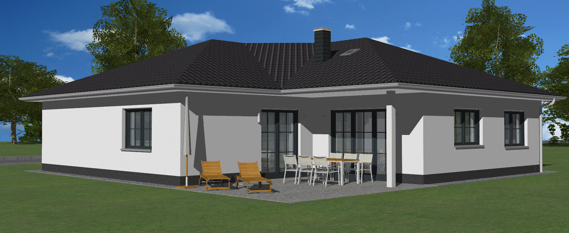 Mal was anderes. Und einfach schön. Der Bungalow 111 ist schon etwas Besonderes unter den eingeschossigen Häusern. Genau wie die äußere Form wirkt auch der Innenbereich sehr großzügig. Auf 125 m² Wohnfläche ist Platz für die ganze Familie: 4 Zimmer, Küche, Hausanschlussraum, ein separates WC und ein Bad mit Platz für 2 Waschtische.