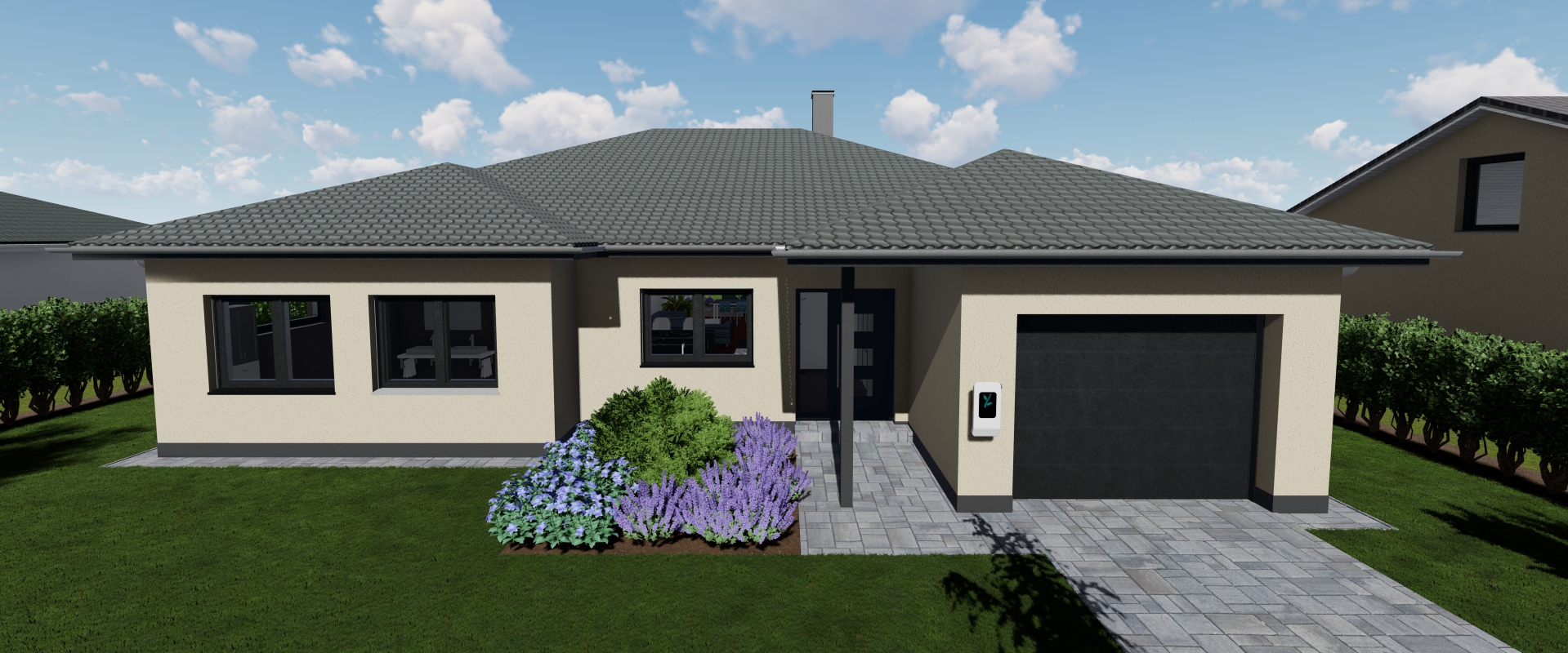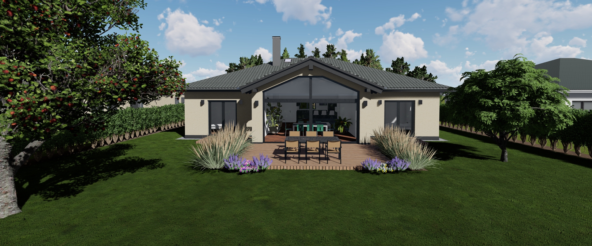 Unser Bungalow 120 vereint viele gute Eigenschaften: Durchdacht, komfortabel, praktisch & schick. Von der Küche hat man den Eingang immer im Blick, vom Wohnzimmer schaut man in den Garten. Und dennoch liegen beide Räume direkt beieinander. Die hohe Kathedraldecke mit viel Glas sorgt für Licht und Großzügigkeit.