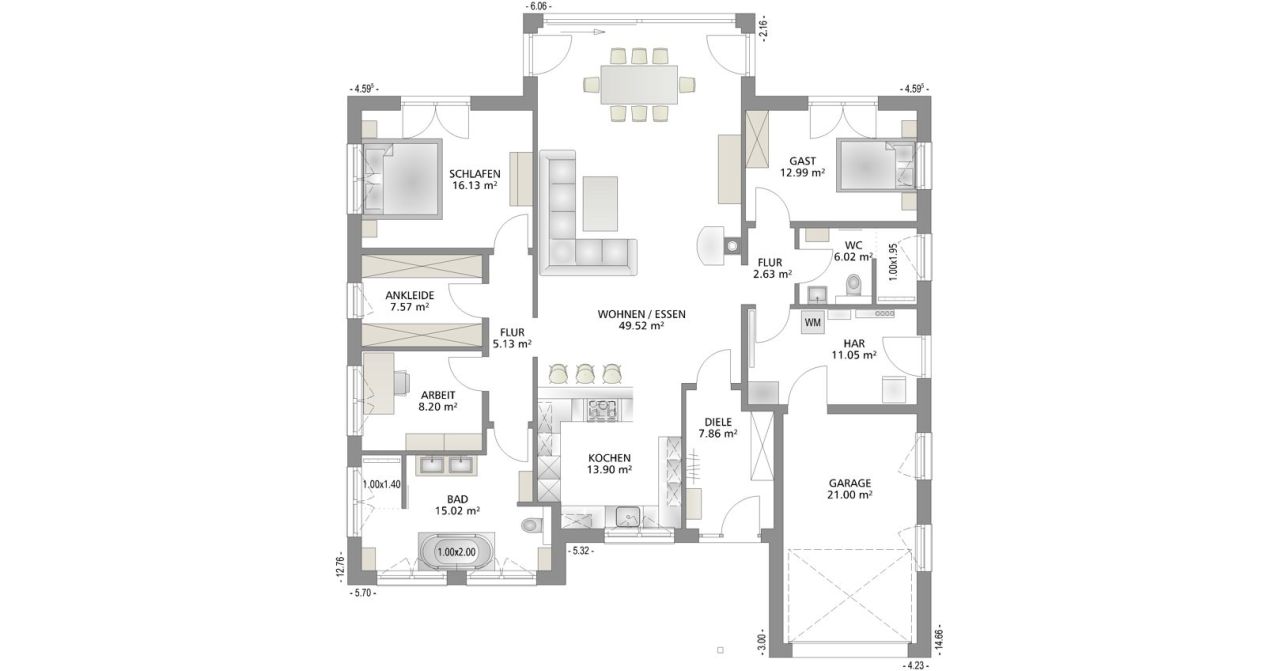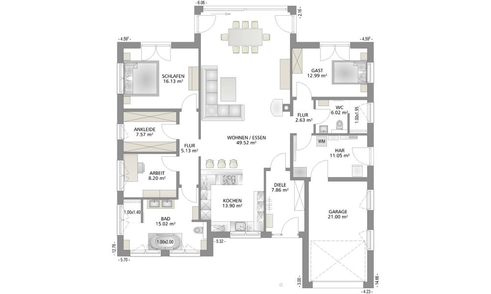 Der Grundriss teilt sich in 3 Bereiche. In der Mitte spielt das Leben. Hier wird gegessen, gefeiert oder entspannt. Auf der linken Seite befindet sich der private Bereich mit Schlafzimmer, Ankleide, Masterbad und einem kleinen Arbeitszimmer. Auf die andere Seite können sich die Übernachtungsgäste zurückziehen. Ein Hausanschlussraum mit ins Haus integrierter Garage komplettiert das Haus.