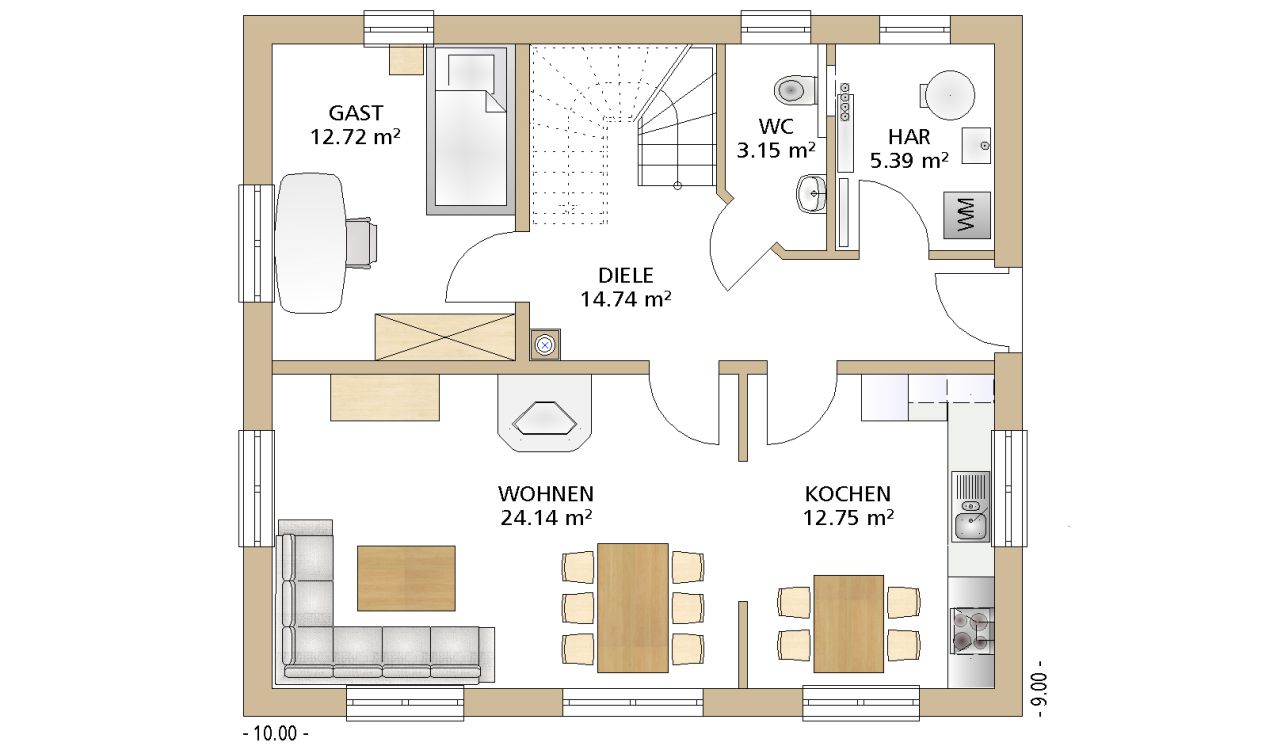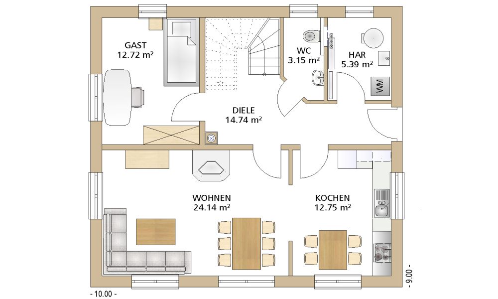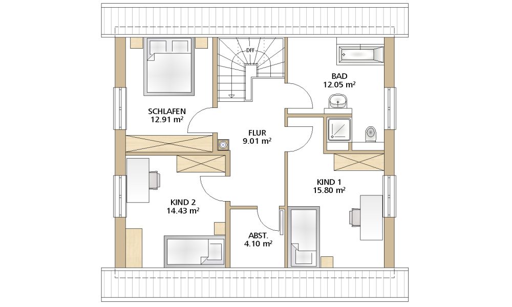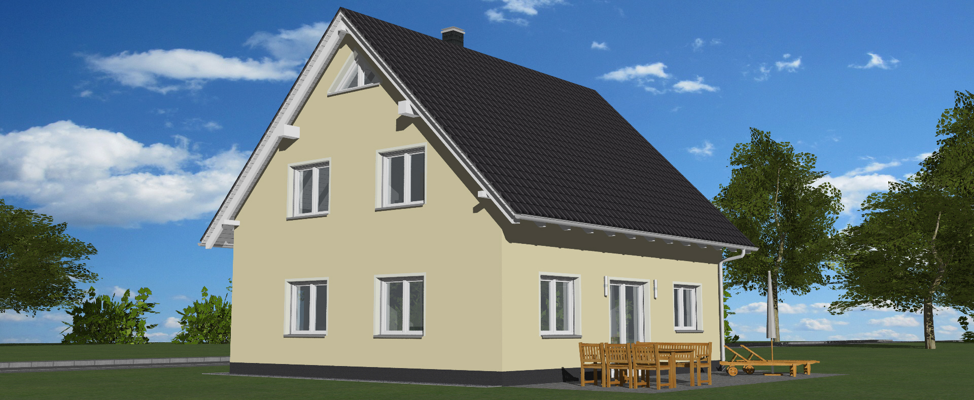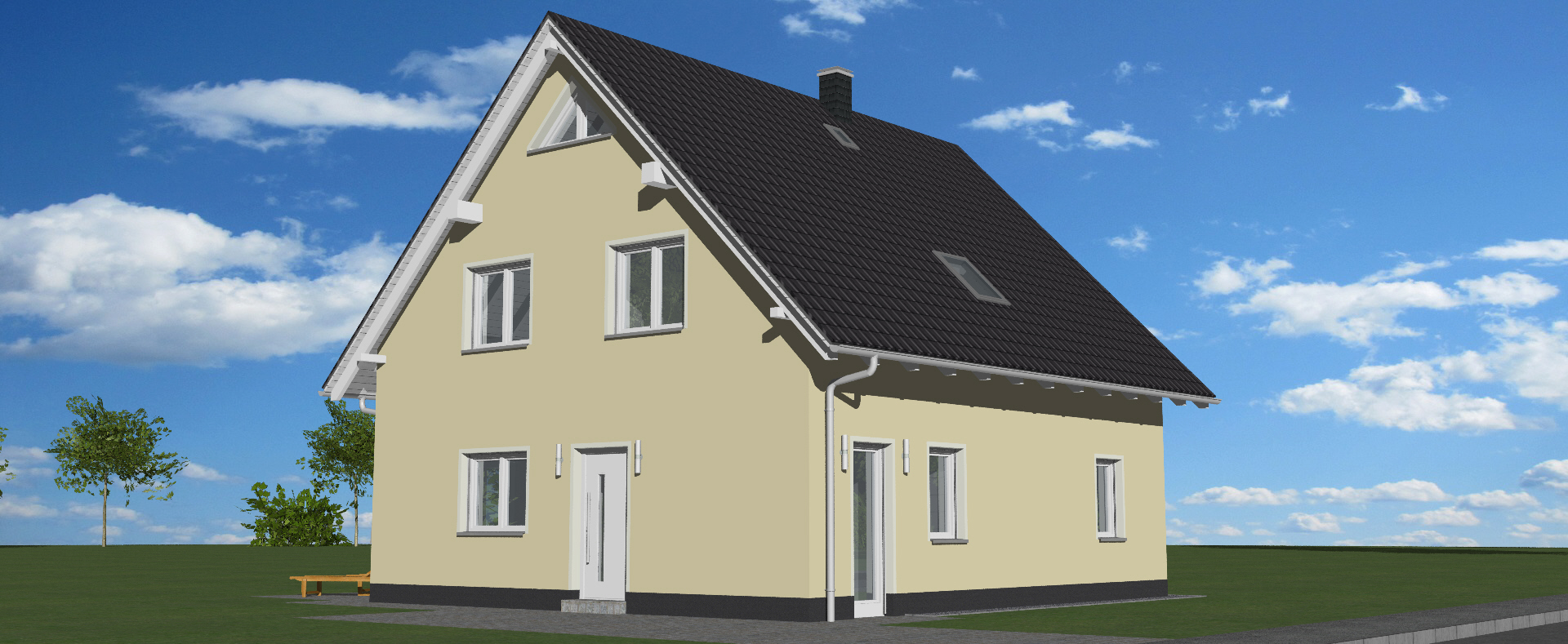 Das Satteldach kennzeichnet auch den Klassiker 205. Die Außenmaße von 9,00 x 10,00 m passen auf nahezu jedes Grundstück.