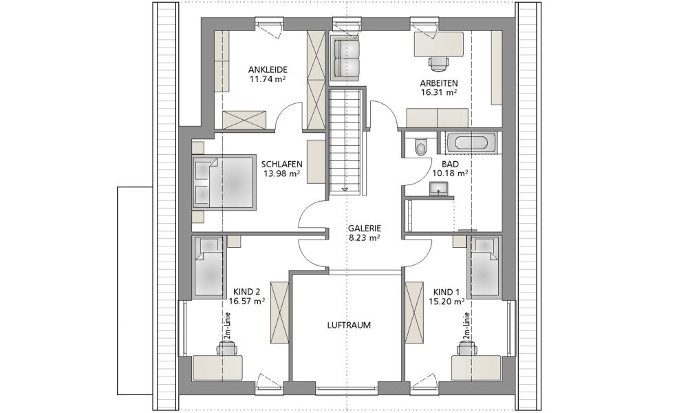 Das Zweifamilienhaus verfügt über eine großzügige und helle Hauptwohnung mit offenem Wohn- und Essbereich sowie offener Küche. Darüber hinaus gehören eine Garderobe, ein Gäste-WC und ein Hauswirtschaftsraum zum Erdgeschoss. Eine gerade Treppe führt ins Obergeschoss mit fünf Zimmern, die jeweils als Schlaf-, Kinder- oder Arbeitszimmer genutzt werden können. Außerdem gibt es ein Familienbad mit Badewanne und begehbarer Dusche.